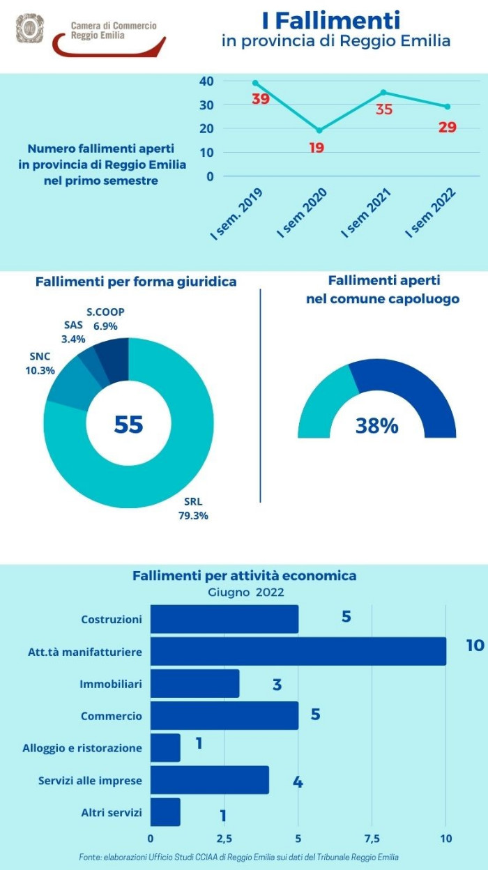 Sono diminuite del 17%, rispetto allo stesso periodo dello scorso anno, le procedure fallimentari aperte in provincia di Reggio nel primo semestre del 2022: da gennaio a giugno sono state 29, contro le 35 dello stesso semestre del 2021.