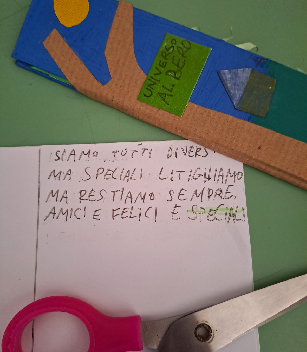 Condividere l’apporto creativo a un progetto collettivo è quello che si è svolto nei laboratori degli anni precedenti, e due grandi libri, uno di cartone e uno con le pagine ritagliate in legno, dipinti e lavorati insieme, erano lo scenario in cui si interpretavano storie, due enormi leporelli che già nelle sue illustrazioni raccontavano l’idea di luoghi, storie, vicende.