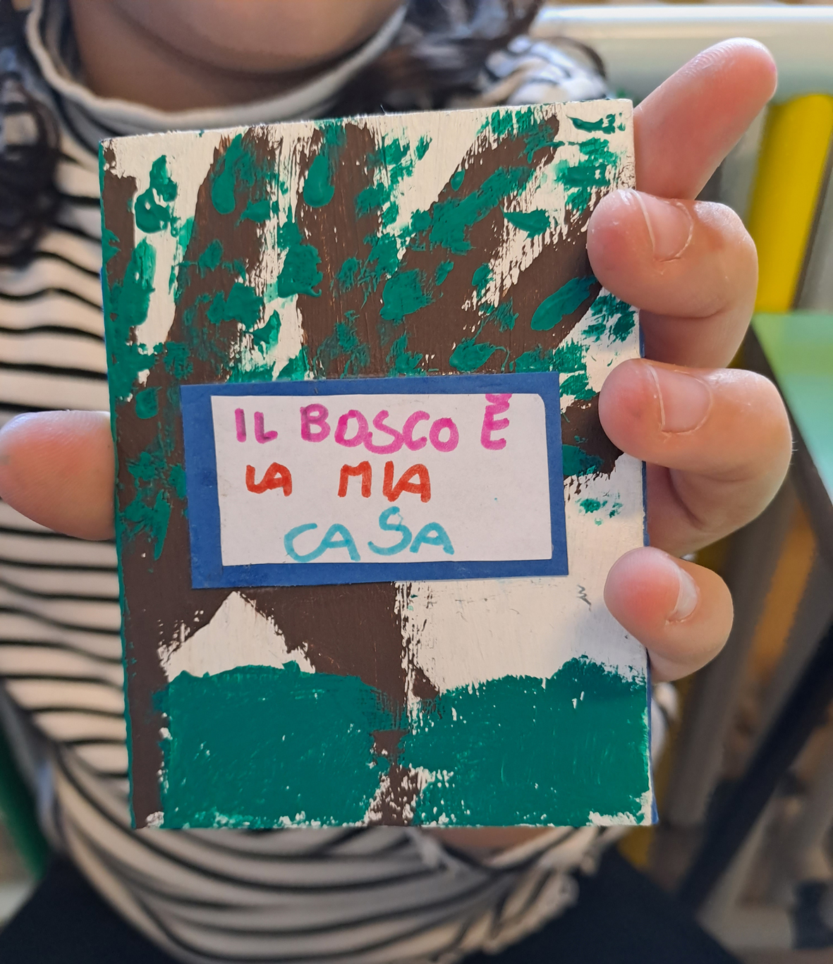 Venerdì, in Biblioteca a Villa Minozzo, si espongono invece una serie di libri di piccolo formato che i bambini e le bambine delle classi seconda, terza e quinta hanno appena finito di elaborare. Nel laboratorio che da quest’inverno si è appena concluso si sono proposte tre diverse tipologie di struttura di libro, in modo che ogni classe lavorasse su una stessa idea ma sempre svolgendola come ognuno meglio ritenesse. Ci sono una serie di libri stretti e lunghi, in cui le pagine sono un aprirsi di foglie tra cui sono nascoste innumerevoli creature, e bacche, e frutti: dalla grandezza dell’albero, al dettaglio di chi vive ognuna delle parti che la compongono. Poi ci sono dei pieghevoli su carta tinta a mano e stampati con piccoli timbri che gli autori si sono scambiati dopo averli incisi. “Una stanza nel bosco”, “L’albero è un universo” alcuni dei titoli che si sono scelti: il tema che ha accompagnato tutto è il laboratorio è il bosco, o meglio, la relazione tra noi e il bosco, gli alberi, gli esseri che lo vivono. L’avvicinamento al mondo della metafora, del simbolo e all’uso di parole che non raccontino solo di forma narrativa ha reso più facile la scrittura libera con cui ognuno ha scritto un proprio componimento, alcuni inseriti tra le pagine, altri ad accompagnare un libro tutto disegnato.