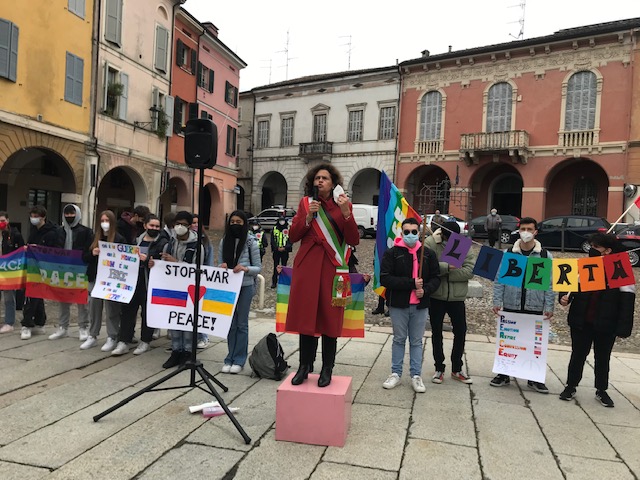 “Grazie a tutti voi per l’idea di organizzare questa marcia per la pace in solidarietà al popolo ucraino che sta vivendo un tempo tragico della propria storia – ha esordito la prima cittadina guastallese Camilla Verona – Ogni giorno vediamo immagini di quei luoghi che dicono più di tante parole. Ringraziamo tutte le forze dell’ordine che si sono messe a disposizione in un tempo brevissimo per agevolare il nostro arrivo qui in piazza. Siamo oltre mille persone, un numero davvero considerevole e ricco di significato. Siamo qui per la pace e dobbiamo chiederci come possiamo, con azioni concrete, essere veri promotori di pace. La nostra città e il nostro territorio hanno aperto le porte a famiglie, prevalentemente donne e bambini, che stanno fuggendo dal conflitto e qui con noi c’è una vostra collega, Alexandra, una studentessa ucraina che è davanti con le lacrime agli occhi. L’accoglienza è quindi un modo per promuovere concretamente la pace. Ma dobbiamo fare di più, ossia dobbiamo promuoverla a partire dalle nostre famiglie e dalle nostre relazioni, conn i nostri amici, cn i nostri compagni di scuola. Dobbiamo alimentare all’interno delle nostre comunità la pace, la concordia, il dialogo, la fratellanza e l’amicizia. Quando realizziamo questi valori, risulta più difficile alimentare pensieri di guerra, di sopraffazione e di morte. E quando ci sono dissidi o difficoltà, il dialogo è l’unica arma utile per ricomporre un clima di pace vera.