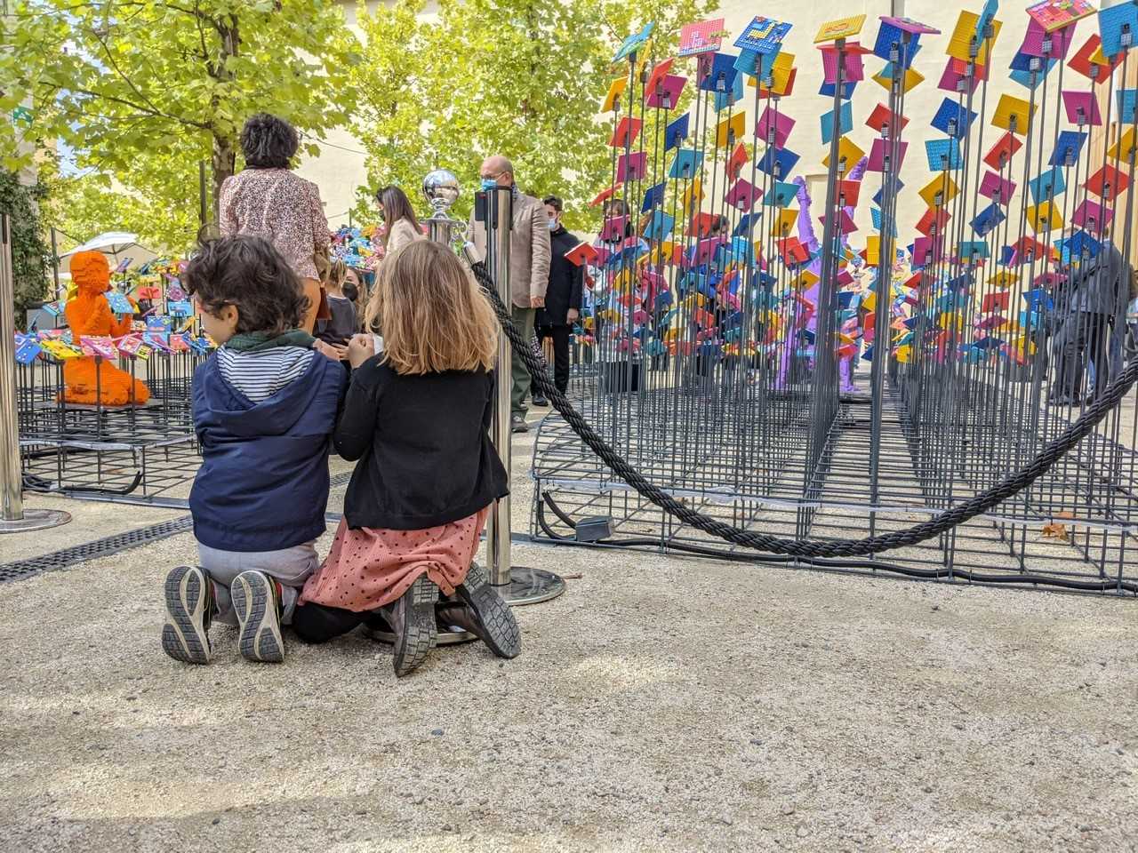 Nello spazio monumentale dei Chiostri, due onde colorate si affiancano e possono essere attraversate dal pubblico. E’ la forma che ha dato Riccardo Zangelmi ai mille mosaici colorati supportati da steli di ferro e realizzati nelle scorse settimane da bambini, famiglie, cittadini e studenti di più di dieci scuole. Hanno utilizzato 320 mila LEGO Dots e hanno rappresentato la propria idea di esseri viventi. Emergono tre statue di bambini in mattoncini, opere di Zangelmi, che rendono omaggio all’entusiasmo e alla creatività dell’infanzia, che danza, gioca, gioisce e partecipa a quest’installazione collettiva.