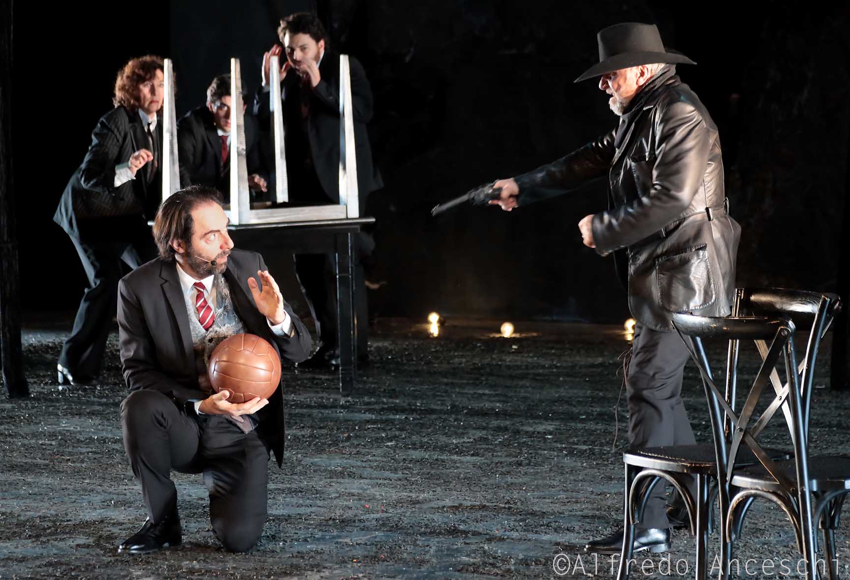 Lo spettacolo però divaga e dà spazio anche a molti altri aneddoti: il racconto dell’arbitro colombiano Alvaro Ortega, ucciso per aver negato una rete alla squadra dei narcos di Medellin; la storia di Francisco Valdes, capitano del Cile, costretto dai militari di Pinochet a segnare a porta vuota contro la Russia.