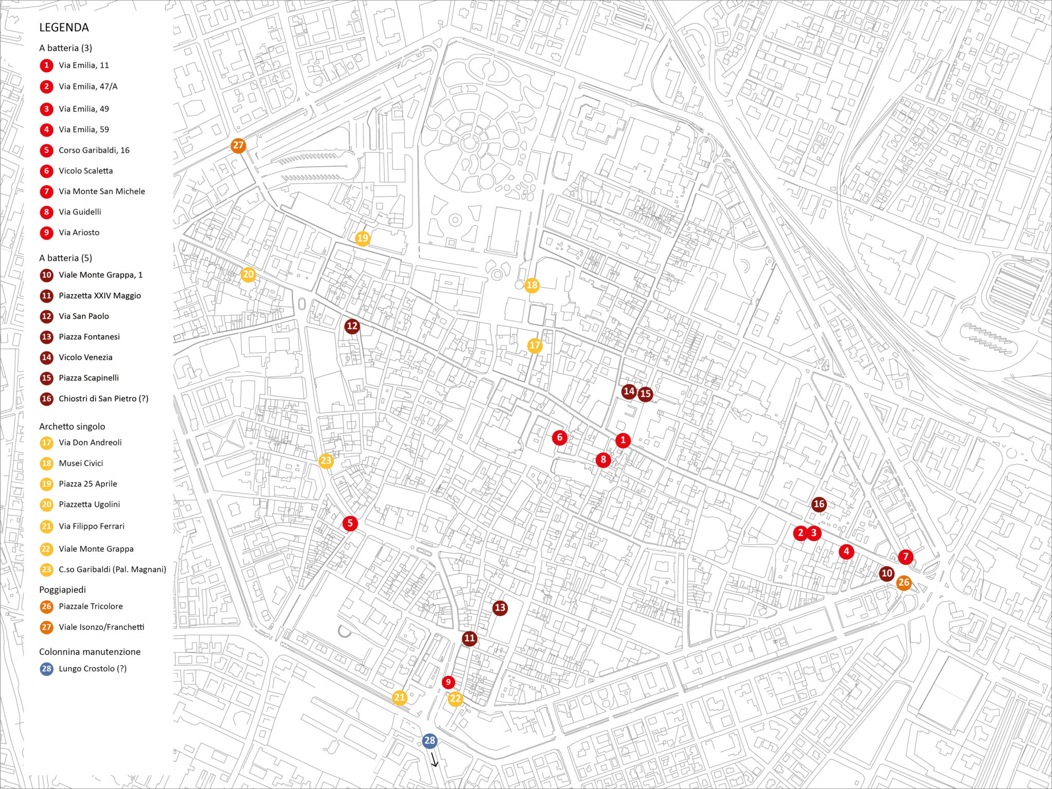 E’ in corso, lungo strade particolarmente frequentate e presso edifici di servizi pubblici e culturali particolarmente frequentati del centro storico e di alcuni quartieri, l’installazione di 250 nuovi posti-sosta per le biciclette, singoli o sistemati in gruppi di rastrelliere (mappa allegata).