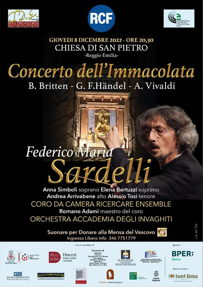 Giovedì 8 dicembre, alle 20.30, la chiesa di San Pietro a Reggio ospiterà il Concerto dell’Immacolata di Federico Maria Sardelli, con musiche di Britten, Händel e Vivaldi: si esibiranno le soprano Anna Simboli ed Elena Bertuni, l’alto Andrea Arrivabene e il tenore Alessio Tosi con il coro da camera Ricercare Ensemble (maestro del coro Romano Adami) e l’orchestra dell’Accademia degli Invaghiti. In questo caso il ricavato della serata sarà devoluto alla Mensa del vescovo di Reggio.