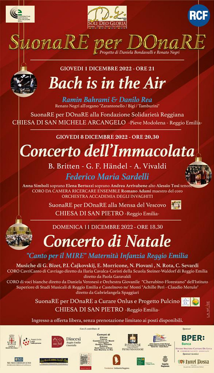 Si parte giovedì primo dicembre alle 21 con “Bach is in the Air”, un dialogo tra due pianoforti in cui la musica classica si sposa con l’improvvisazione jazz: i protagonisti saranno il pianista iraniano Ramin Bahrami e Danilo Rea, autorità indiscussa nel mondo del pianismo jazz italiano, accompagnati da Renato Negri all’organo Zarantonello/Bigi/Tamburini della chiesa di San Michele Arcangelo di Pieve Modolena. Il ricavato della serata andrà a sostegno della Fondazione Solidarietà Reggiana.