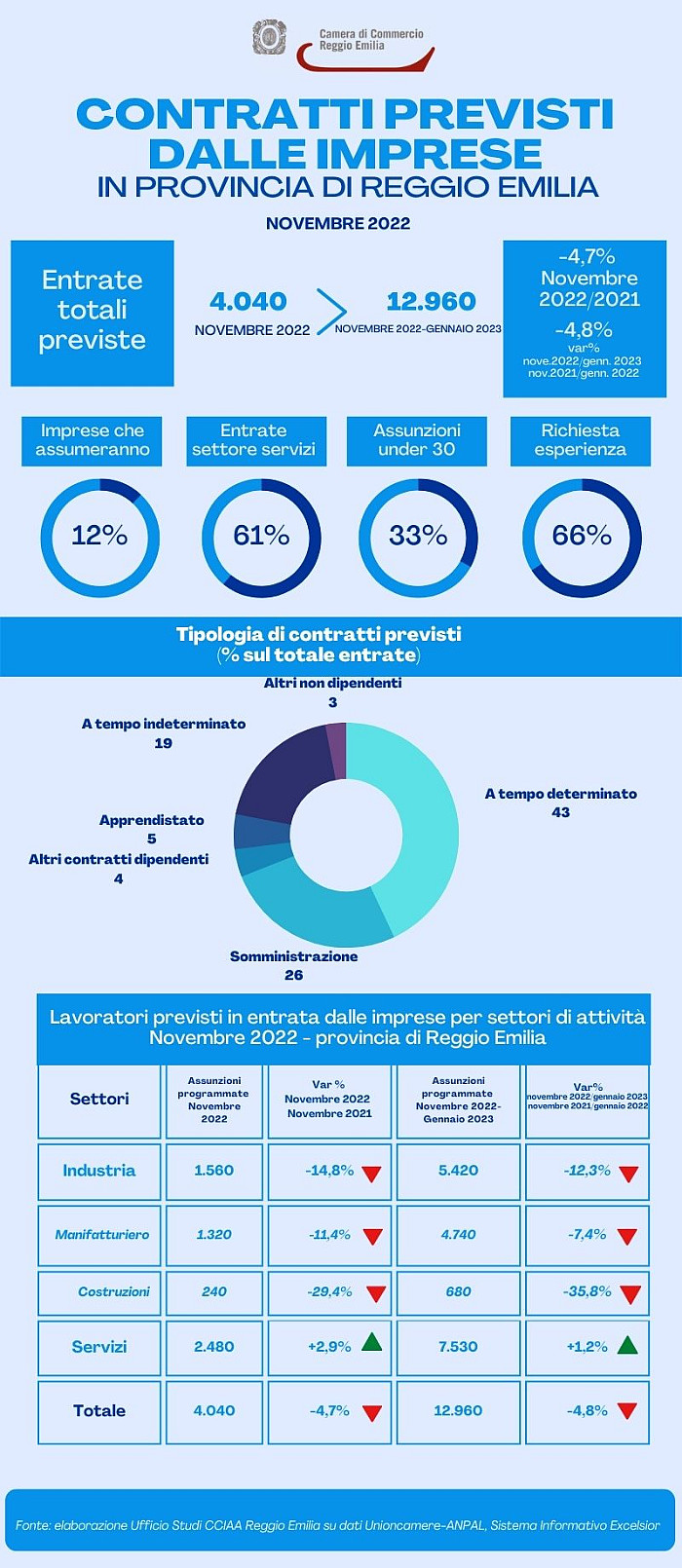 Le aziende della provincia di Reggio, seppur con un ritmo più contenuto rispetto agli ultimi mesi del 2021, stanno continuando ad assumere: sono infatti 4.040 i nuovi contratti di lavoro previsti a novembre, e 12.960 complessivi quelli per il trimestre novembre 2022/gennaio 2023.