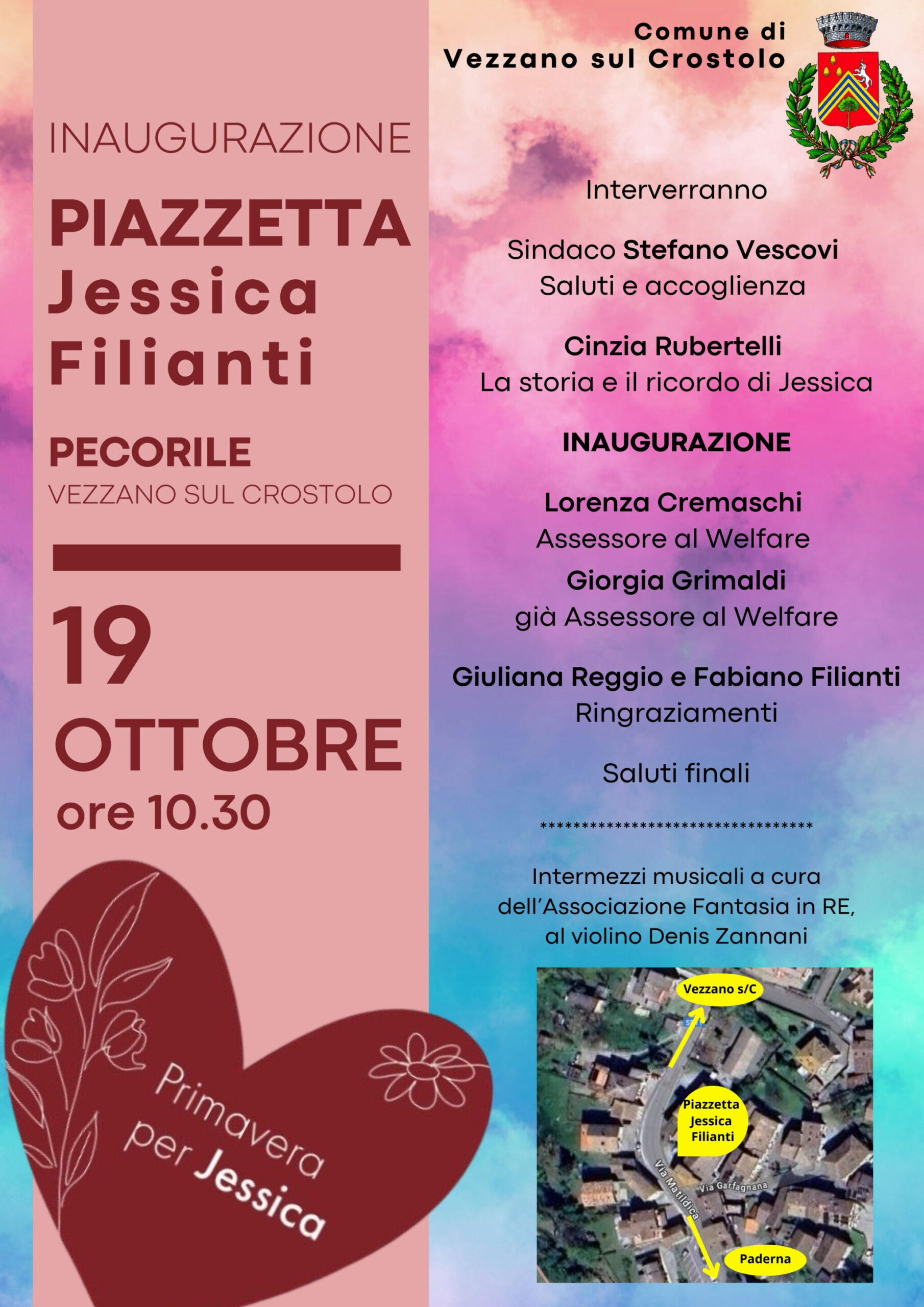 Il Consiglio Comunale di Vezzano sul Crostolo 2019-2024 ha deliberato all’unanimità di intitolare a Jessica Filianti (1978 – 1996) una piazzetta a Pecorile di fronte alla casa in cui hanno vissuto i nonni ed il papà di Jessica.