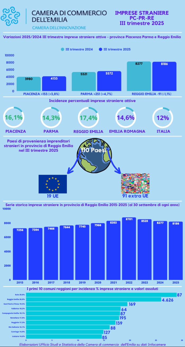 Quanto alla distribuzione territoriale delle imprese guidate da imprenditori e imprenditrici di origine straniera, è il comune capoluogo a guidare la classifica assoluta: a Reggio sono complessivamente 4.626 le imprese di questo tipo, che rappresentano il 26% del tessuto economico locale. Se si guarda invece all’incidenza relativa al proprio territorio comunale di riferimento, il primato spetta a Rolo: le sue 87 imprese a guida straniera “pesano” infatti per il 29% del totale. Al terzo posto, dopo il capoluogo Reggio, c’è Sant’Ilario d’Enza, con 169 aziende guidate da persone straniere e un’incidenza relativa del 19,5%.