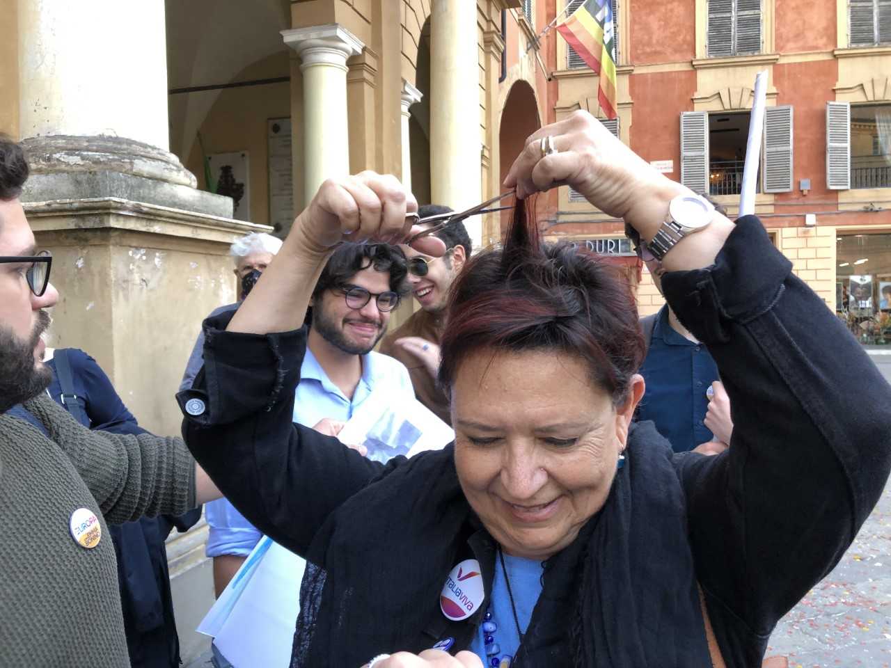 Tanti cittadini reggiani e iraniani hanno preso parte al flash mob in piazza Prampolini e hanno voluto tagliare una ciocca di capelli, un gesto simbolico di vicinanza alle donne iraniane. che sta facendo il giro del mondo.
