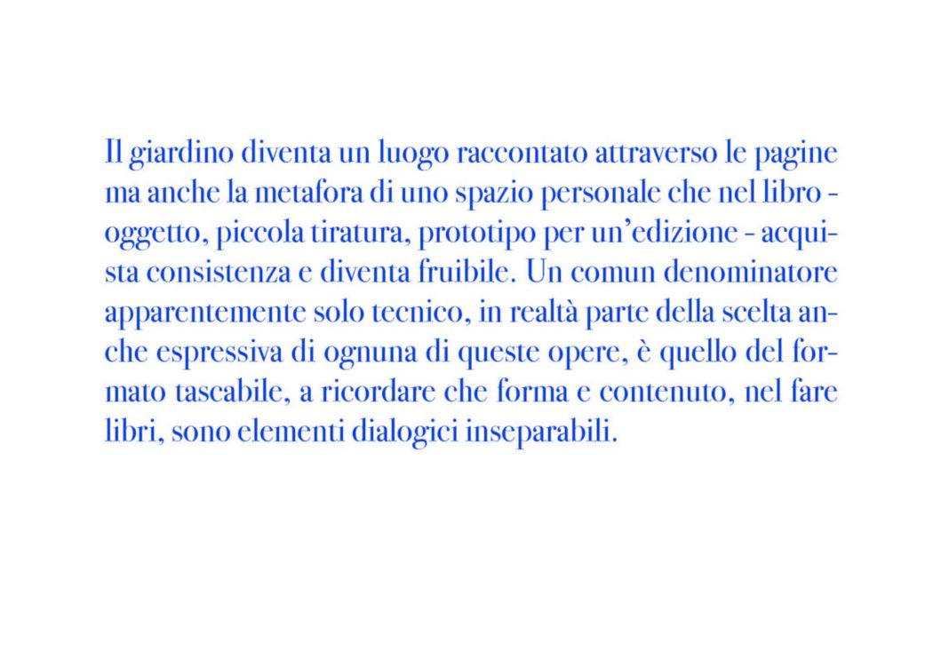Il tema su cui si dipana quella che Pellacani ha definito “una piattaforma sperimentale di ricerca e confronto multidisciplinare sulla creatività” in questa sua edizione segue il ragionamento che di anno in anno si dipana nel Festival, cioè quello di un connubio, o un dialogo via via arricchito nei contributi e nelle angolature, tra le arti e le scienze, all’insegna di una rinnovata incursione sul fare anche artigianale e una progettazione ibrida nelle ispirazioni e negli alfabeti usati. “Garden Book. Libri d’artista, giardini della mente” (che dà il titolo anche al volume che accompagna la mostra, edito da Consulta librieprogetti) gioca tra gli affondi nel mondo della botanica, con erbari e quaderni da giardini e orti, e in quello più intimo delle visioni che appartengono agli artisti e che, nel libro, trovano una forma narrativa in cui le normali regole della comunicazione verbale o figurativa perdono i contorni.