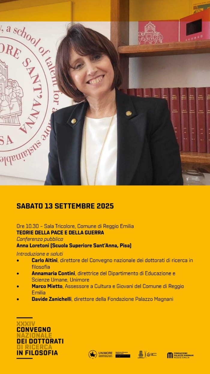 Si tratta di un importante ritorno – l’ultima edizione reggiana fu nel 2010, dopo dodici edizioni organizzate dall’Istituto Antonio Banfi – che segna anche la possibilità di ascoltare voci autorevoli del pensiero contemporaneo su temi di stretta attualità, come la lectio magistralis di Anna Loretoni (Scuola superiore Sant’Anna di Pisa) su “Teoria della pace e della guerra”, in programma sabato 13 settembre alle 10.30 in Sala del Tricolore, in municipio.