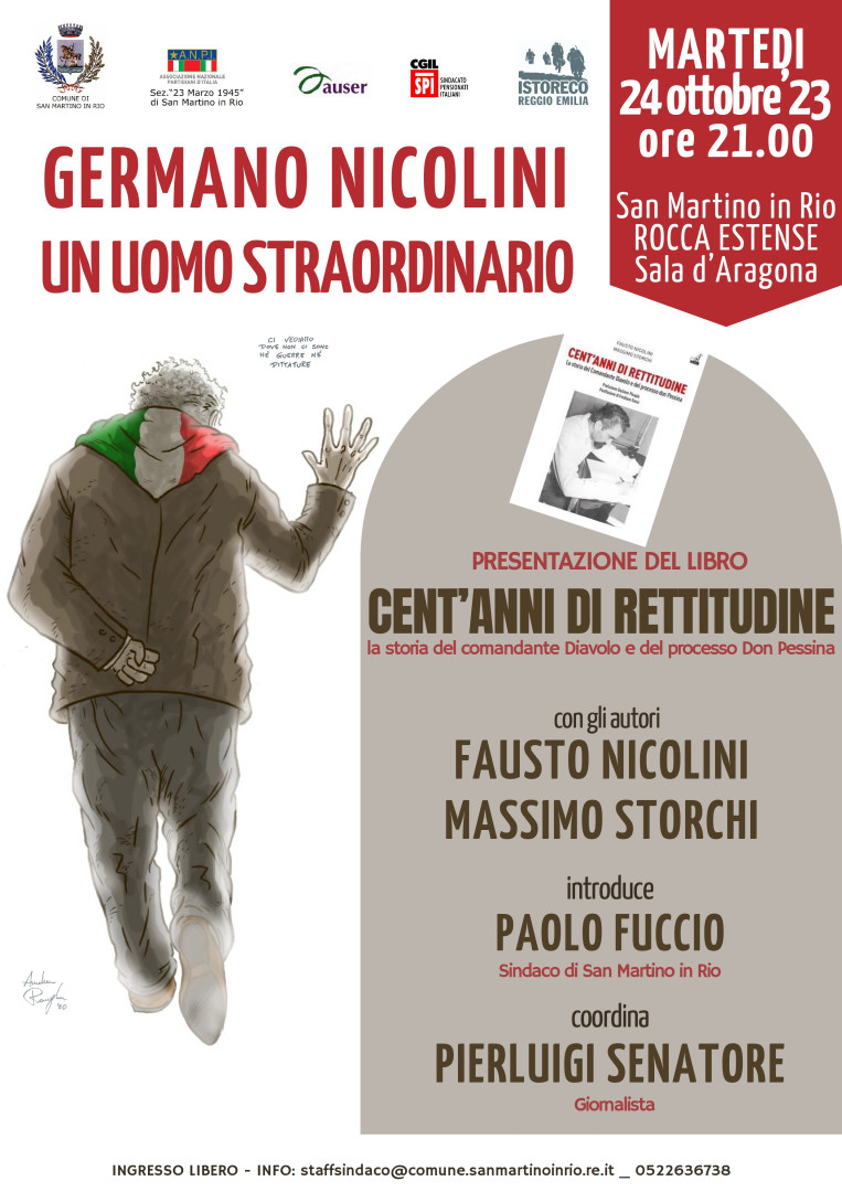 A San Martino in Rio (Bassa reggiana) una serata per ripercorrere le tappe della vita di Germano Nicolini, scomparso il 24 ottobre 2020 alla soglie dei 101 anni, ex sindaco di Correggio, comandante partigiano con il nome di battaglia Diavolo, che pagò innocente, con il carcere, l’ingiusta condanna per l’omicidio di don Umberto Pessina, curato di campagna a San Martino Piccolo, ammazzato da latri partigiani comunisti nel giugno del 1946. Il Diavolo venne pienamente riabilitato e riconosciuto innocente ed estraneo a quei fattio solo dopo mezzo secolo, negli anni Novanta.
