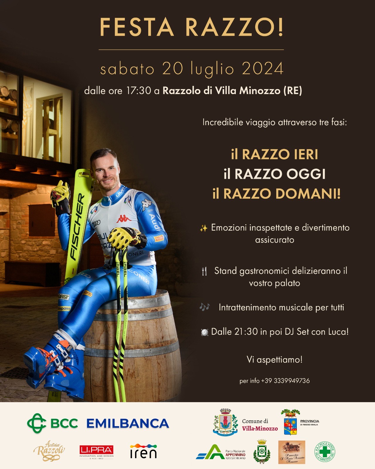 Ora Villa Minozzo dedica una festa al suo campione: “Con grande entusiasmo e un pizzico di nostalgia, siamo lieti di annunciare una festa speciale in onore della straordinaria carriera del nostro amico e campione di sci, Giuliano Razzoli “Razzo”. La festa, aperta a tutti gli appassionati di sport e amici, si terrà sabato 20 luglio dalle 17.30 presso il borgo di Razzolo di Villaminozzo RE.