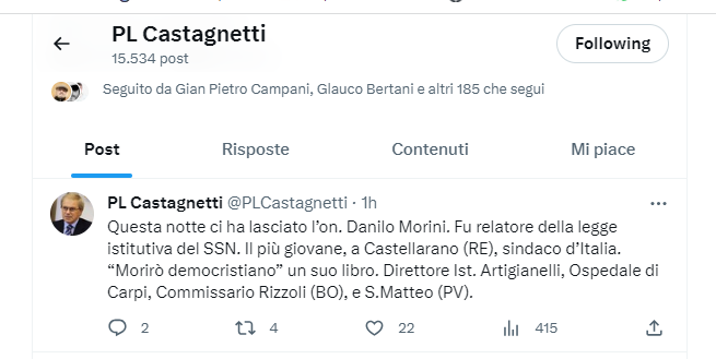 L’Associazione Nazionale Partigiani Cristiani (Anpc), sezione di Reggio Emilia, esprime il proprio cordoglio per la morte dell’onorevole Danilo Morini e, nel manifestare vicinanza alla famiglia, vuole ricordare e fare memoria della figura e della testimonianza politica e civile che Danilo Morini ha offerto al servizio del Paese e della sua comunità, Castellarano, che ha servito come sindaco (il piu giovane sindaco d Italia), il suo impegno parlamentare e il fondamentale ruolo avuto nell’approvazione della Riforma Sanitaria e nella gestione di importanti strutture ospedaliere.