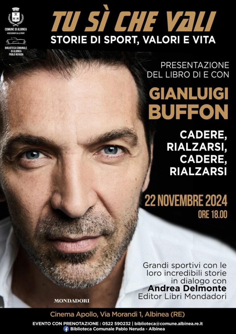 L’appuntamento con Buffon sarà venerdì 22 novembre, alle ore 18, al Cinema Apollo di via Morandi 1 ad Albinea, attiguo alla Biblioteca. L’autore dialogherà sul suo libro “Cadere, rialzarsi, cadere, rialzarsi” (Mondadori) con Andrea Delmonte, Editor di Mondadori. Si tratta della seconda uscita ufficiale per il libro del campione che sarà disponibile nelle librerie dal 19 novembre (dal 7 novembre in preordine).