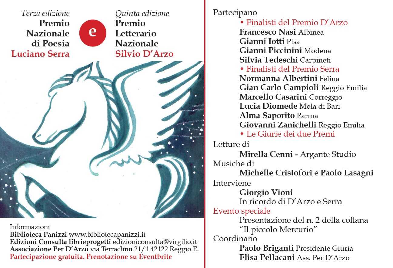 Francesco Nasi, Albinea; Gianni Iotti, Pisa; Gianni Piccinini, Modena; Silvia Tedeschi, Carpineti per il Premio D’Arzo e Normanna Albertini, Felina; Gian Carlo Campioli, Reggio Emilia; Marcello Casarini, Correggio; Lucia Diomede, Mola di Bari; Alma Saporito, Parma; Giovanni Zanichelli, Reggio Emilia per il Premio Serra. Modera l’incontro Elisa Pellacani di Consulta Libri&Progetti e rappresentante dell’Associazione “Per D’Arzo”. La partecipazione all’evento è gratuita e la prenotazione obbligatoria su Eventbrite.it. Per partecipare all’incontro è obbligatorio il Green Pass rafforzato e la mascherina FFP2.