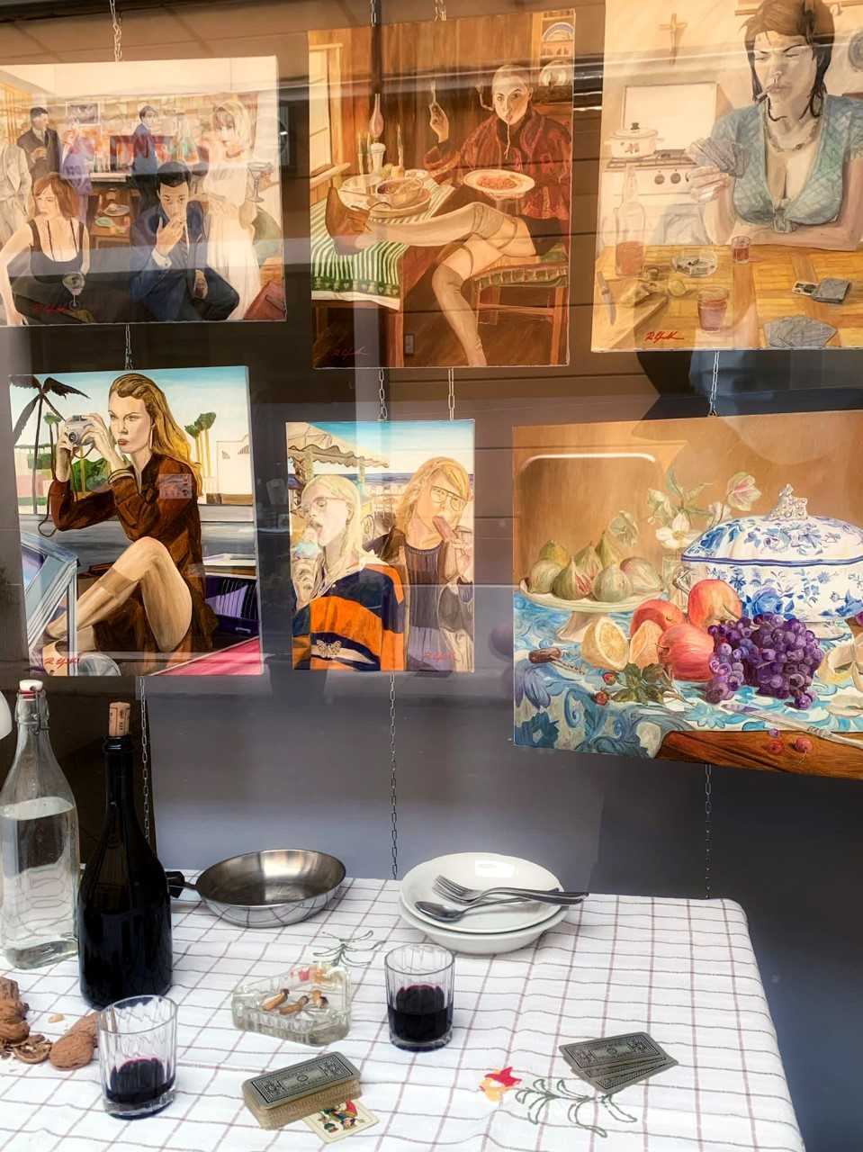 “Per l’allestimento della vetrina di Roberto Cafarotti – spiega Giulia Crema – mi hanno ispirato le due opere pittoriche con soggetti femminili che colgono attimi di vita quotidiana, autentici e reali. Abbiamo quindi riprodotto la scena di una tavola apparecchiata in modo spartano e l’intimità di un momento come può essere quello di una semplice partita a carte. In questa stessa vetrina ritroviamo la scultura in legno di cedro “Arte” realizzata per l’iniziativa da Massimiliano Mora, che ringrazio anche per la preziosa collaborazione”.