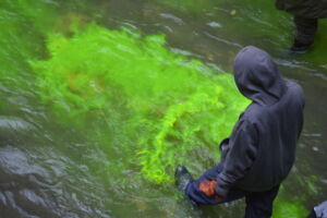 Anche Bologna – con il canale di Reno della celebre “finestrella” in pieno centro – è finita nel mirino del blitz ambientalista di Extinction Rebellion che in diverse città italiane ha tinto di verde le acque dei fiumi e dei canali, utilizzando un tracciante totalmente innocuo usato anche da geologi e speleologi (la fluoresceina).