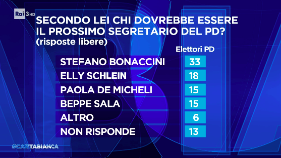 Il sondaggio: nel derby emiliano Bonaccini davanti alla Schlein. Stando poi al sondaggio mandato in onda da Bianca Berlinguer a Cartabianca, su Rai 3, che prende in esame tutti i possibili candidati, ufficiali, semi-ufficiali o ufficiosi, le speranze su Schlein sono basse: i dati di Berlinguer danno infatti in pole il governatore dell’Emilia Romagna Bonaccini che raggiunge il 33% dei voti degli intervistati, e dietro di lui, la sua vice Elly Schlein, che raccoglie solo il 18%.