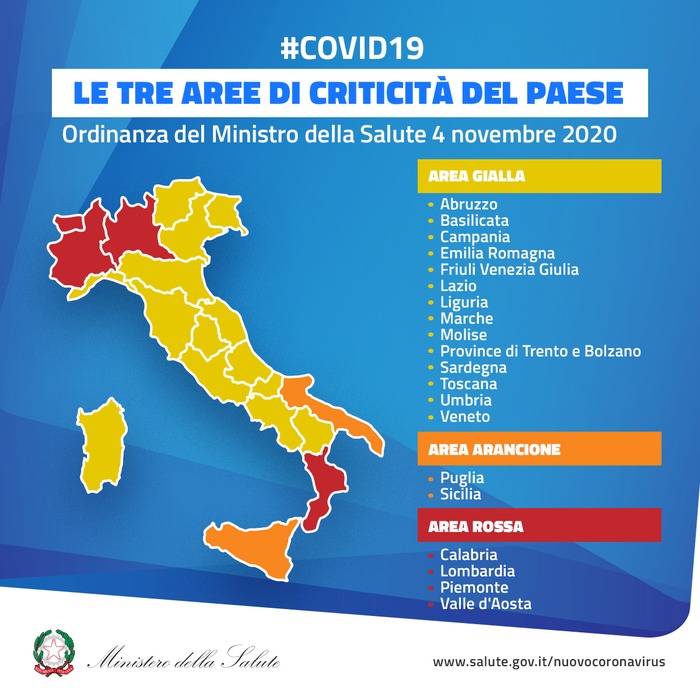 E ancora: nelle giornate festive e prefestive sono chiusi gli esercizi commerciali all’interno dei centri commerciali e dei mercati, ad eccezione di farmacie, parafarmacie, presìdi sanitari e punti vendita di generi alimentari, tabacchi ed edicole; capienza al 50% per il trasporto pubblico locale e il servizio ferroviario regionale; sospensione degli spettacoli e delle mostre aperti al pubblico in teatri, sale da concerto e musei; stop alle attività di palestre, piscine e centri benessere; raccomandazione al più ampio uso dello smart working per le attività lavorative e professionali, sia nel privato che nel pubblico impiego.