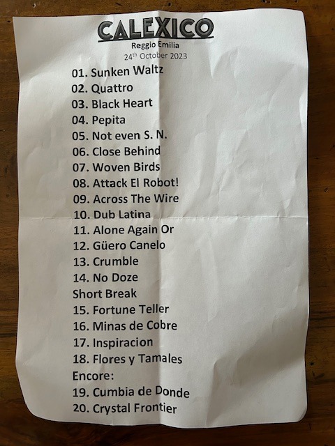 Joey Burns, come prima Lopez, saluta in italiano… E poi le prime note di “Suken Waltz” scaldano il pubblico che inzia a muoversi sulle poltrone di velluto rosso. La scaletta (vedi foto) comprende venti canzoni, la maggior parte delle quali fanno parte dell’album “Feast Of Wire” del 2003.