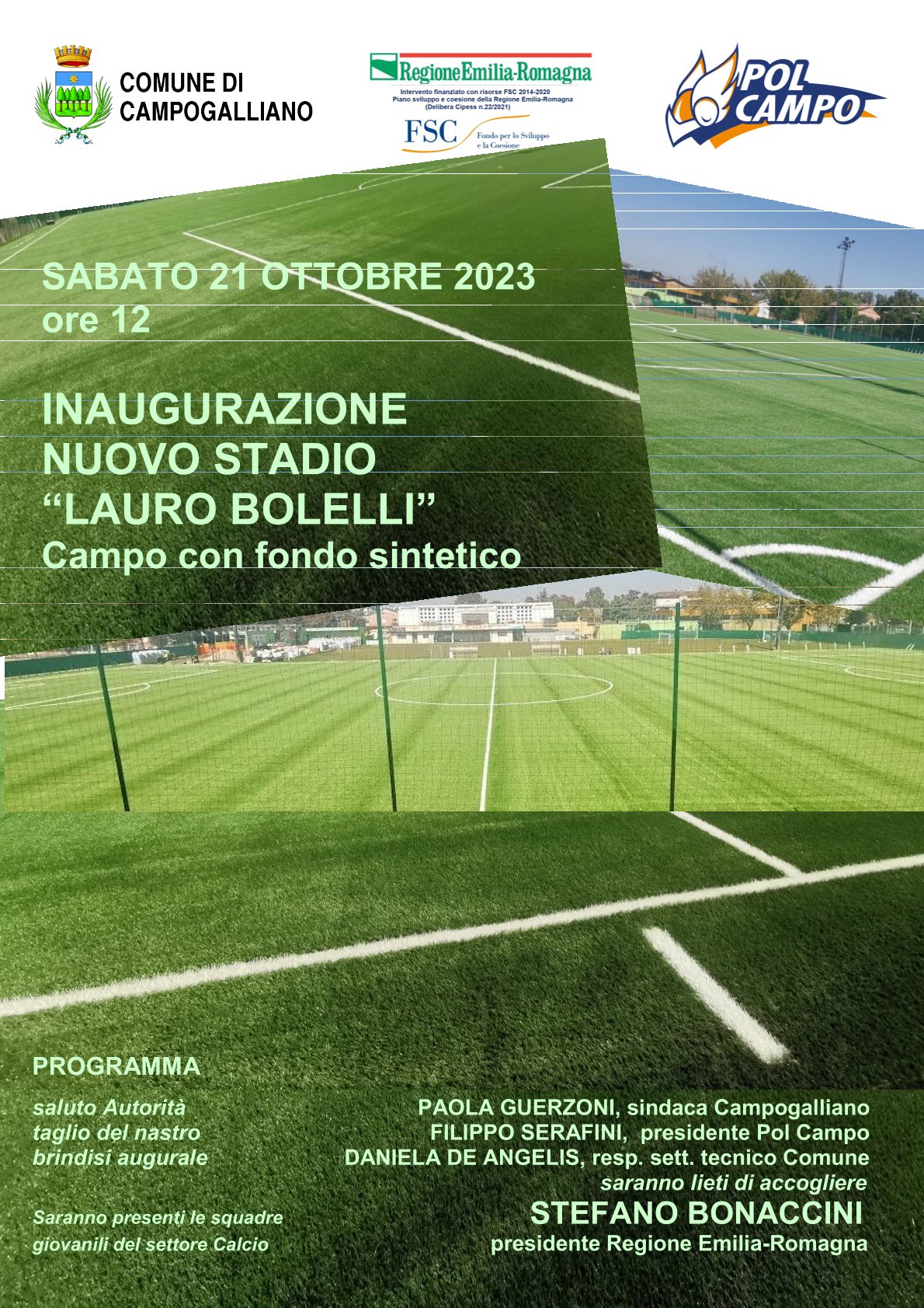 Sarà il Presidente della Regione Emilia-Romagna Stefano Bonaccini, sabato 21 ottobre alle ore 12, ad inaugurare il nuovo campo in sintetico del centro sportivo “Lauro Bolelli”. Il nuovo campo da calcio in manto sintetico oggetto di un’importante riqualificazione dal costo complessivo di 570.000 euro, dei quali 300.000 finanziati dalla Regione Emilia-Romagna con Fondi FSC e 270.000 da risorse del Comune, verrà inaugurato con una cerimonia che vedrà, oltre al presidente Bonaccini, la sindaca Paola Guerzoni, il presidente della Polisportiva Campo Filippo Serafini e la responsabile dell’ufficio tecnico comunale Daniela De Angelis e che vedrà le squadre giovanili del settore calcio schierate.