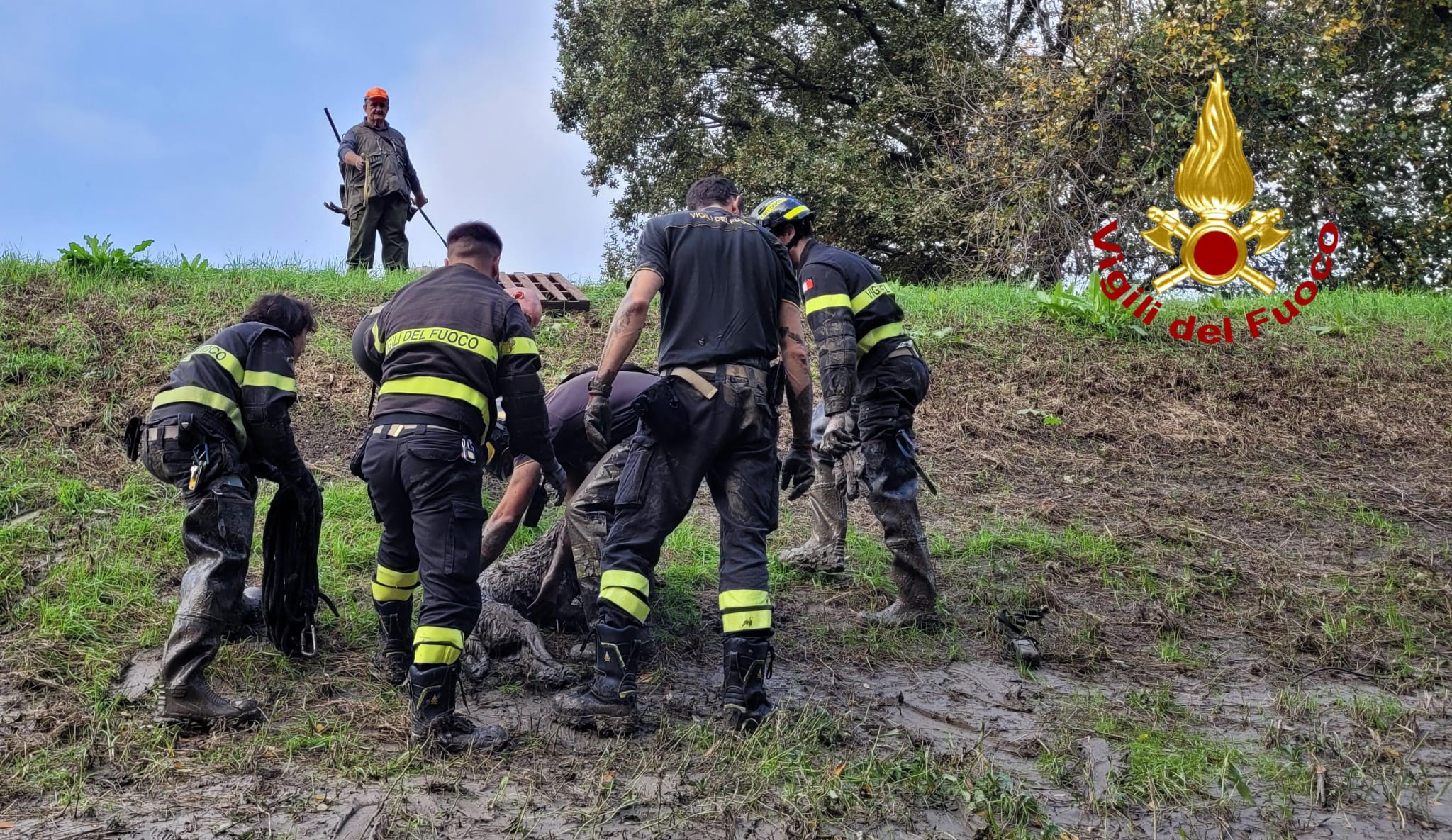 La squadra, con tecniche fluviali, è riuscita ad estrarre dal fango l’animale, stremato ma salvo, e a riconsegnarlo al proprietario.