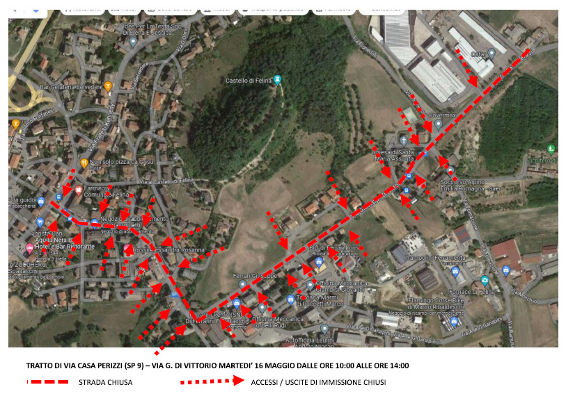 Saranno vietati gli accessi ai suddetti tratti stradali con chiusura delle seguenti strade: da via Boralattia a via Casa Perizzi; da via Cardinal Pignedoli a via Casa Perizzi; da via Fornacione a via G. Di Vittorio; da Via Ganapini a via G. Di Vittorio; da via Tegge a Via G. Di Vittorio; da via Rubertelli a via G. Di Vittorio; da via Piazza del Mulino a via G. Di Vittorio; da via W. Manfredi a via G. Di Vittorio; da piazza Zanni a via F.iii Kennedy; da via Magonfia a via F.lli Kennedy; da via Sabbione a via F.lli Kennedy; da via W. Fontanesi a via F.lli Kennedy; da via Berzana a via Gatta (SP 9); da via Vigna a via Gatta; da via Gnana a via Gatta; da via Ceriola a via Gatta; da via Pioppelle a via Gatta; da via Botteghe a via Gatta; da via Cà degli Osti a via Gatta; da via Salde a Via Gatta. Nel tratto indicato saranno anche chiusi tutti gli accessi alle abitazioni private. Le chiusure saranno dalle ore 10 alle 14.30 circa, e comunque fino alla rimozione della segnaletica di divieto di transito.