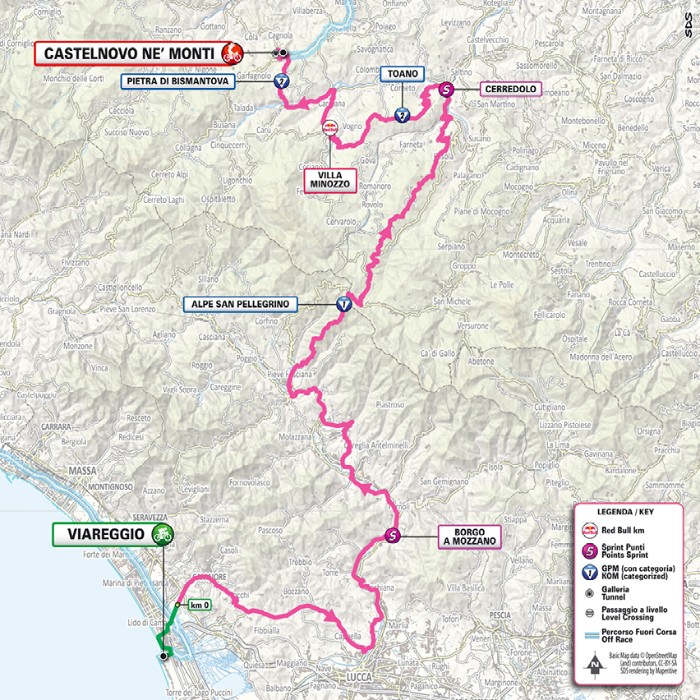 Un percorso di 186 km che prevede un dislivello complessivo di 3.850 metri, prima dell’arrivo della tappa in piazza Matteotti a Castelnovo.