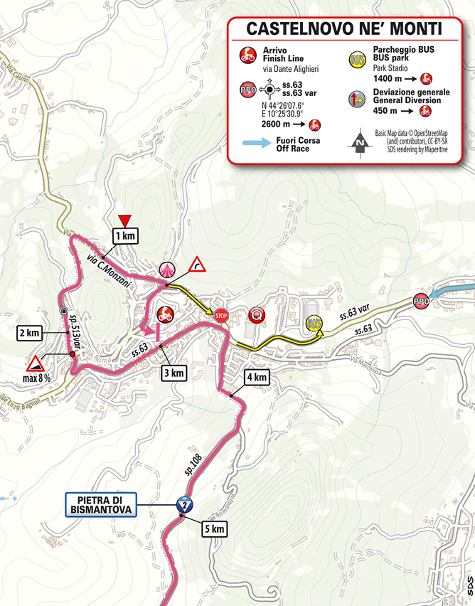 Gli ultimi 3 km della tappa sono caratterizzati da una rampa a salire e una successiva breve discesa, che conducono dentro l’abitato con alcune curve impegnative. Ultimo chilometro tutto a salire, poi retta finale di 100 metri su asfalto di larghezza 6 metri.