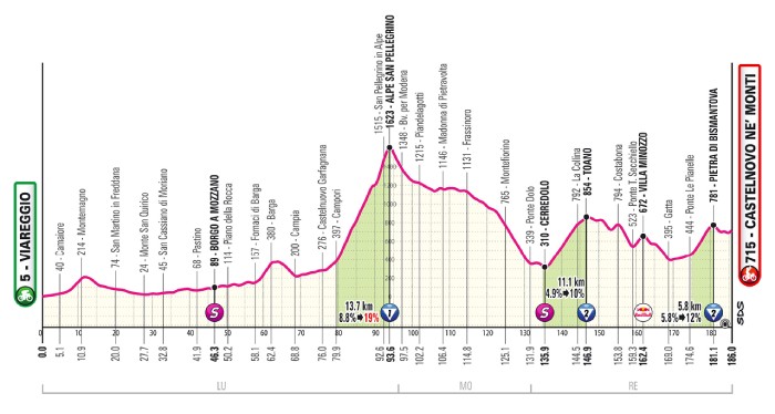 La prima salita incontrata sarà quella di San Pellegrino in Alpe (che si conclude circa un chilometro e mezzo dopo il paese), che presenta – con le sue pendenze attorno al 20% – il settore più duro dell’intero Giro d’Italia 2025. Le altre salite lungo il percorso sono quelle di Toano e della Pietra di Bismantova, che porta direttamente al traguardo di Castelnovo ne’ Monti.