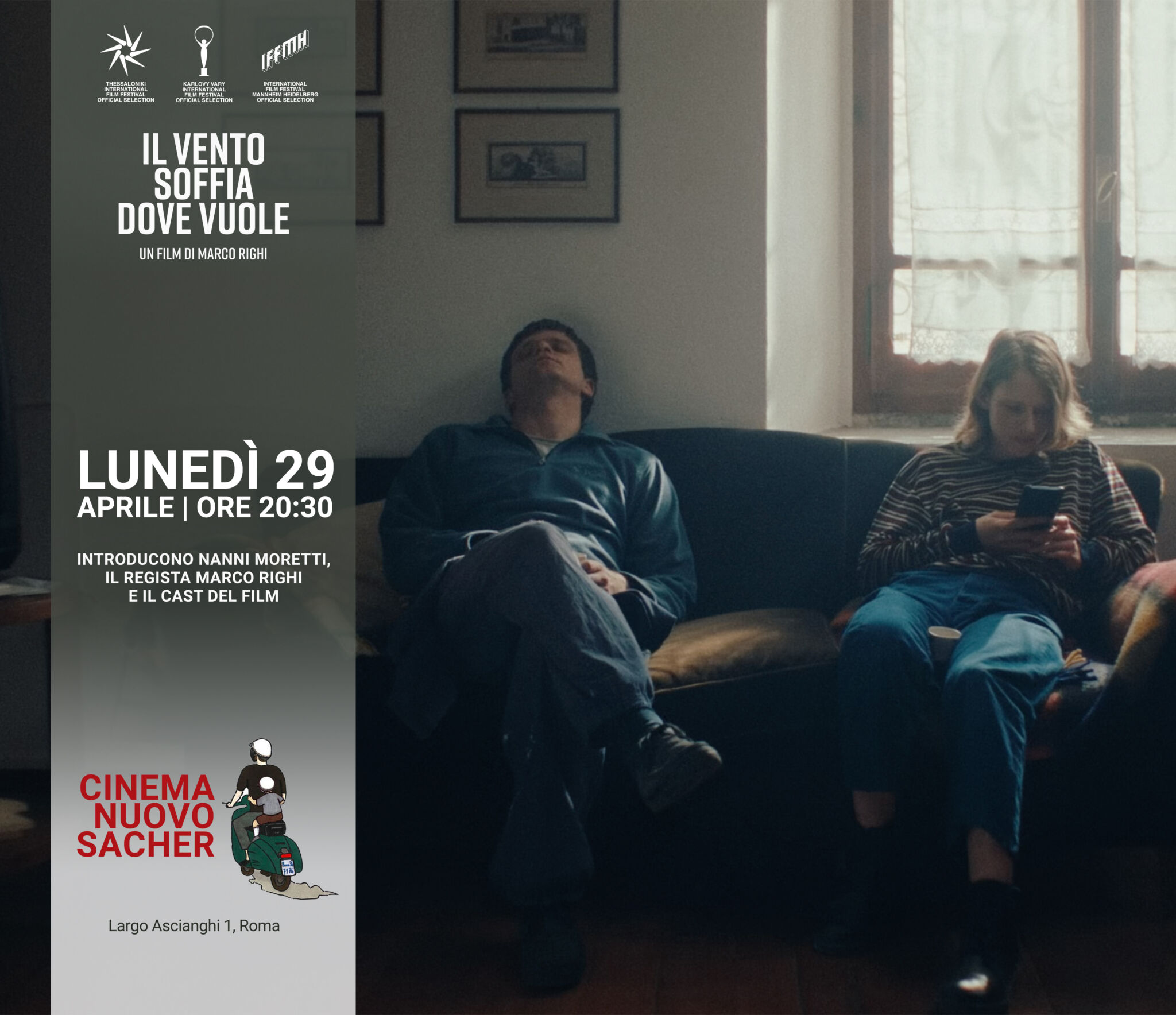 Mentre il 29 aprile (ore 19.00), a Roma, l’appuntamento si rinnova al cinema Nuovo Sacher, ore 20.30. Introduce Nanni Moretti, presente il regista Marco Righi e il cast del film. Undici anni dopo essere stato il trequartista di “Bimbi belli”, il regista Marco Righi tornerà dunque al Cinema Nuovo Sacher nella capitale.