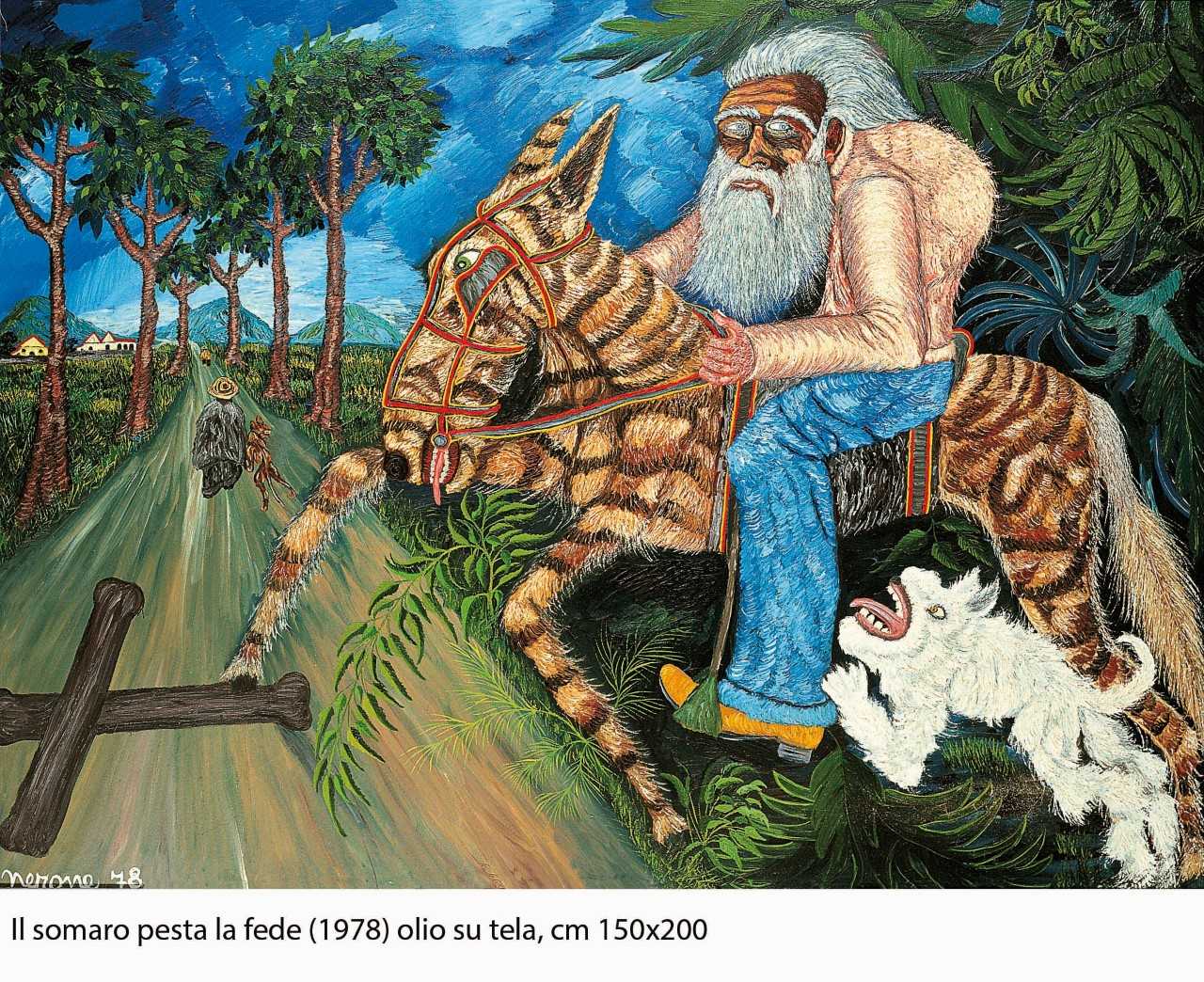 Viveva Ligabue, più che nei film e nei bravi attori che lo hanno interpretato, nel cuore, nella vita e nell’opera di Nerone, deciso a riscattarlo a partire dal nome potente e minaccioso. Non era un erede, non un allievo, per la naturale incompatibilità di Ligabue con una scuola; ne era una reincarnazione, più misurata, più contenuta, nonostante il nome. Nerone aveva lo stesso sangue, e respirava la stessa aria, attraversava la stessa nebbia di Ligabue, ne aveva umidi i capelli. I suoi colori avevano gli stessi sapori dei tanti modi di essere del maiale, animale poco dipinto da Ligabue, ma sempre presente e convivente nella campagna padana. Umori, passioni, sapori, colori, forza del fiume sono i medesimi. E oggi, con Nerone, è morto ancora Ligabue, si è ulteriormente allontanato dal nostro modo di vivere il rapporto vero e profondo con la natura, declinando dal profumo dei concimi alle pale eoliche e alla grottesca “transizione ecologica”.