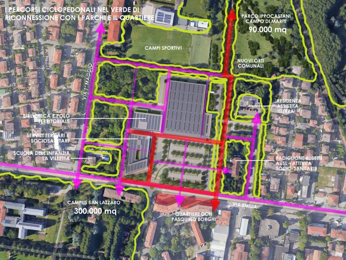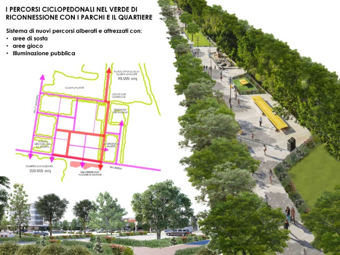 • percorsi ciclopedonali nel verde di riconnessione dei parchi con il quartiere, che saranno attrezzati con aree di sosta, aree gioco e illuminazione pubblica;