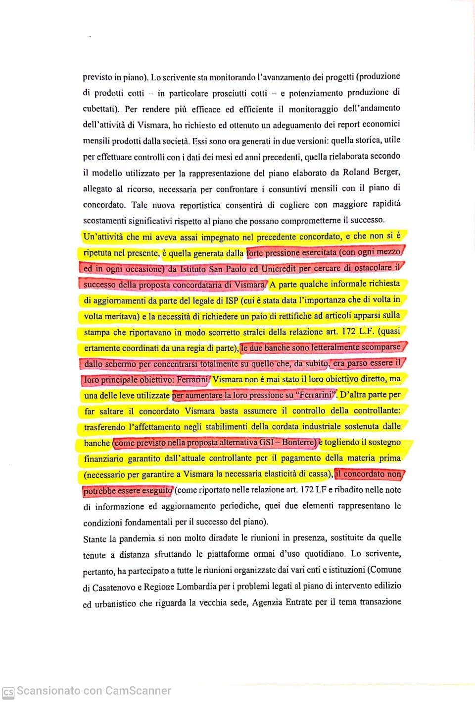 Franco Cadoppi, nel rendiconto della procedura di concordato Vismara, mette nero su bianco che le due principali banche italiane si sono adoperate ‘con ogni mezzo ed in ogni occasione’ per il fallimento di Vismara, con la conseguente messa sulla strada di 164 persone. Non solo, che la perdita di questi posti di lavoro e’ per loro funzionale a perseguire l’unico obiettivo dell’acquisizione di Ferrarini, dal momento che il piano Bonterre prevede l’esubero della produzione di Vismara” e questo “e’ un fatto gravissimo”.