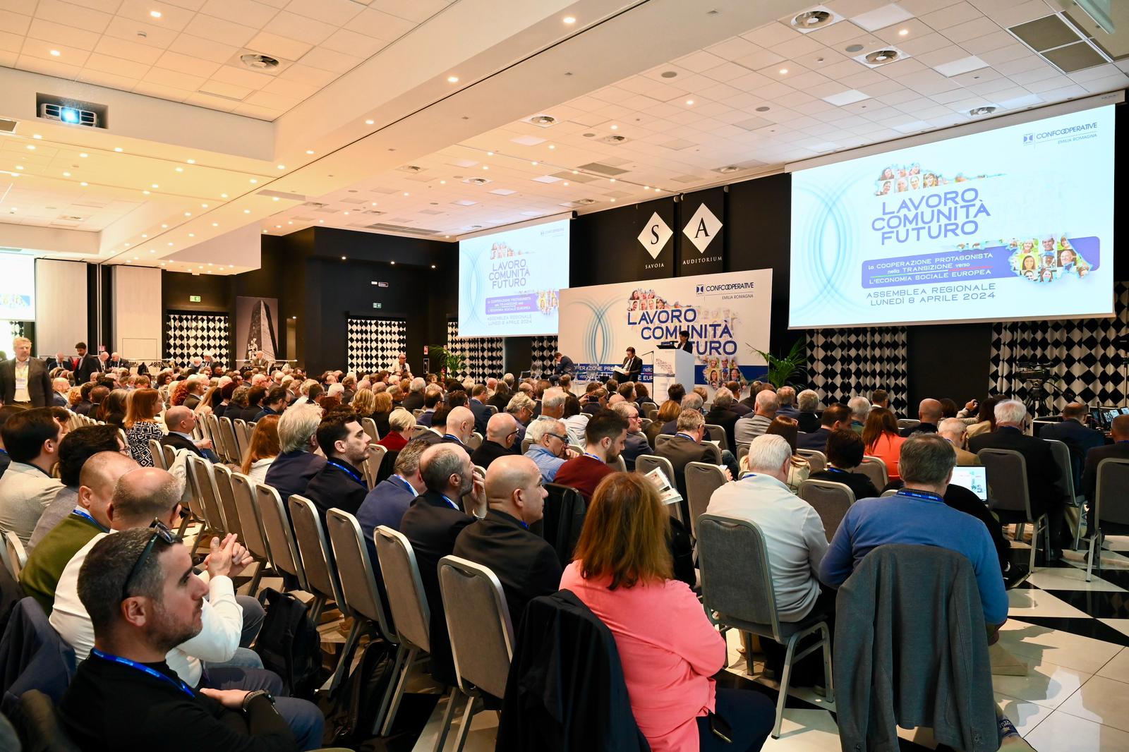 “Questi anni difficili hanno dimostrato come la cooperazione, nonostante tutte le difficoltà, abbia mantenuto integri i principi per i quali è nata e si è sviluppata – ha proseguito Milza durante la lettura della sua relazione -. La cooperazione ha dimostrato di essere resiliente e innovativa nella continuità della propria azione. L’Economia Sociale non è solo un settore tra gli altri ma è uno dei rari ecosistemi industriali selezionati su cui l’Europa punta, nell’ottica di una nuova generazione di politiche capaci di costruire sviluppo sostenibile e accompagnare le transizioni, ambientali, digitali e sociali. Crediamo che questo sforzo europeo debba essere accompagnato da misure e scelte politiche quali, ad esempio, una fiscalità che premi quelle imprese che con la loro azione lavorano per la ricomposizione delle divisioni sociali. A livello nazionale abbiamo già presentato proposte concrete e plaudiamo all’iniziativa della Regione Emilia-Romagna di costituire un ‘Hub sull’innovazione sociale’, con il coinvolgimento anche dell’Università. Già qualche anno fa, le Centrali cooperative avevano suggerito alla Regione di candidarsi a ospitare il Centro europeo per l’economia sociale. L’Emilia-Romagna, a nostro avviso, avrebbe tutte le caratteristiche per potersi proporre, non solo per il peso della cooperazione (13% dell’occupazione), ma anche per le modalità concertative tra gli attori economici e le Istituzioni. Ci impegneremo a promuovere questa visione, attraverso una strategia e obiettivi concreti, anche durante il prossimo mandato. Per questo abbiamo detto no al salario minimo e sì a un salario giusto, combattendo tutte le battaglie che dovevamo in tutti i settori che riguardano noi, i nostri soci e la comunità tutta. Lo abbiamo fatto con uno sguardo aperto e collaborativo con tutti gli attori e i rappresentanti del tessuto economico, perché siamo preoccupati per il futuro e per quello che lasceremo ai nostri figli e ai territori in cui operiamo. Il mondo della Cooperazione, in quanto tale, sente il peso e la responsabilità transgenerazionale insito da sempre nei propri valori”.
