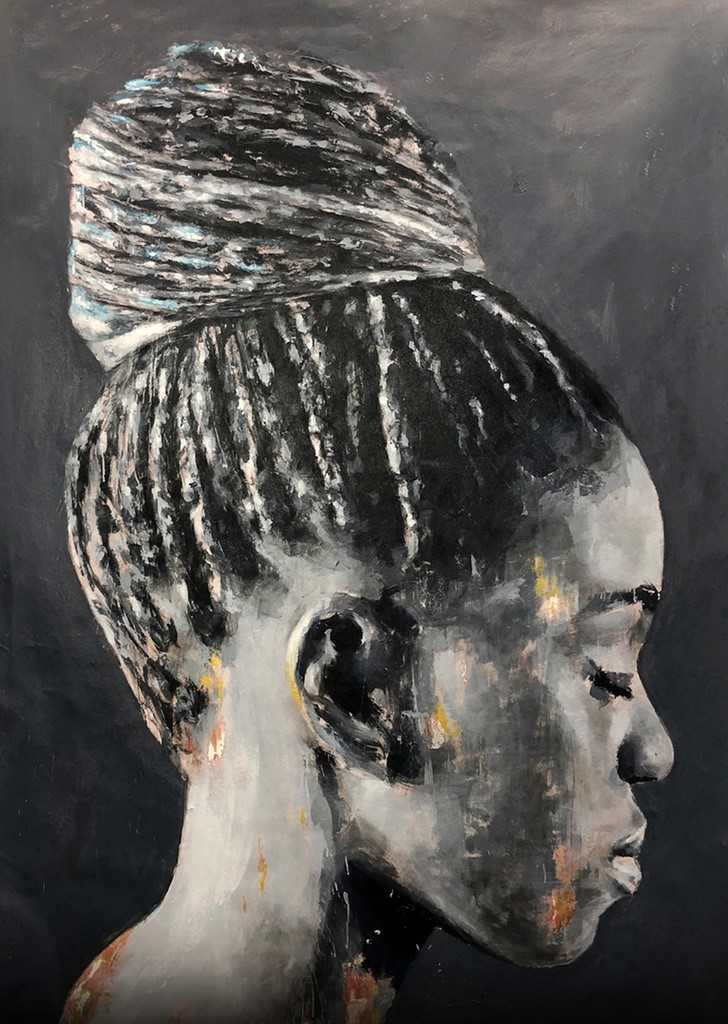 Luigi Christopher Veggetti Kanku, di origini congolesi, opera da tempo sulla scena artistica contemporanea. Dalle sue opere passate in cui ha dipinto, su grandi tele, scorci e vedute di alcune città italiane, traspare il suo grande amore per l’Italia. Tra le sue opere principali ci sono i ritratti di donne nere, in cui viene celebrata la femminilità. In apparenza sono volti che vengono percepiti dalla società come africani, ma l’identità che vuole rappresentare l’artista è un concetto più profondo; molto spesso, infatti, le protagoniste sono giovani donne afroitaliane. Lo spettatore è così spinto a una riflessione sul vero significato dell’identità culturale. L’intero progetto è stato ispirato dall’opera “Le due madri” (2021), conservata alla Galleria d’Arte Moderna a Milano. L’artista dichiara: «Sono molto contento di aver reinterpretato l’opera di uno dei grandi maestri della pittura italiana. Dopo oltre 130 anni questa tela prende vita in un’altra forma, digitale, impregnata di un contenuto sociale inaspettato. Un’opera dolce che tocca tante tematiche allo stesso tempo, senza mai essere provocazione, solo un inequivocabile punto di riflessione». L’artista, con poche e larghe pennellate digitali, ha ritratto l’icona della maternità africana, con il bambino dietro la schiena avvolto dal tipico panno tradizionale. La mano della madre, che guarda l’osservatore con dolce fierezza, accarezza il viso della figlia primogenita.