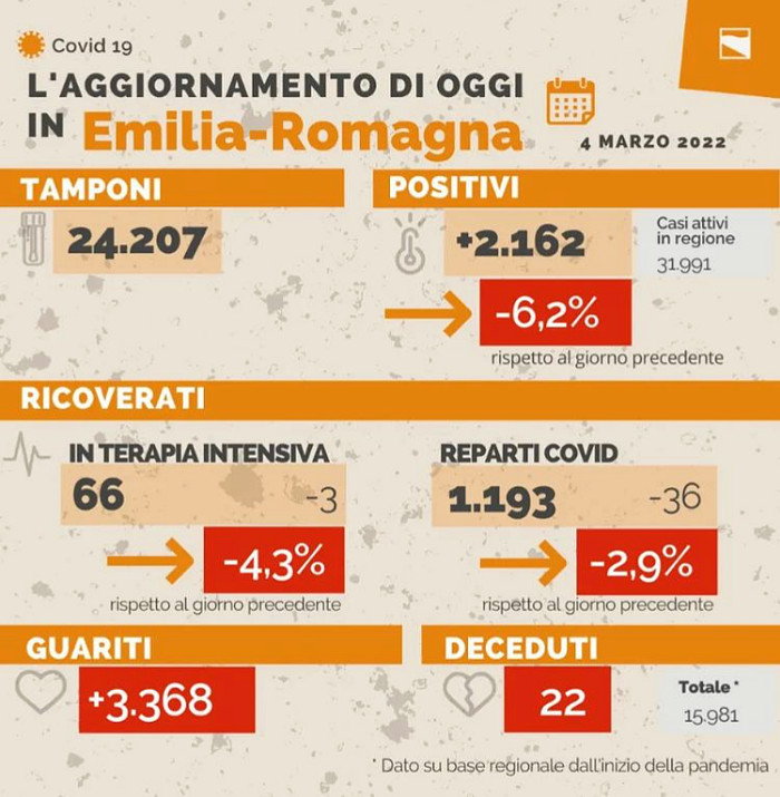 Con i 2.162 contagi registrati venerdì 4 marzo, su un totale di 24.207 tamponi eseguiti nelle precedenti 24 ore (di cui 11.743 molecolari e 12.464 antigenici rapidi), in Emilia-Romagna sono saliti complessivamente a quota 1.194.546 i casi di positività riscontrati in regione dall’inizio dell’epidemia di nuovo coronavirus ad oggi.