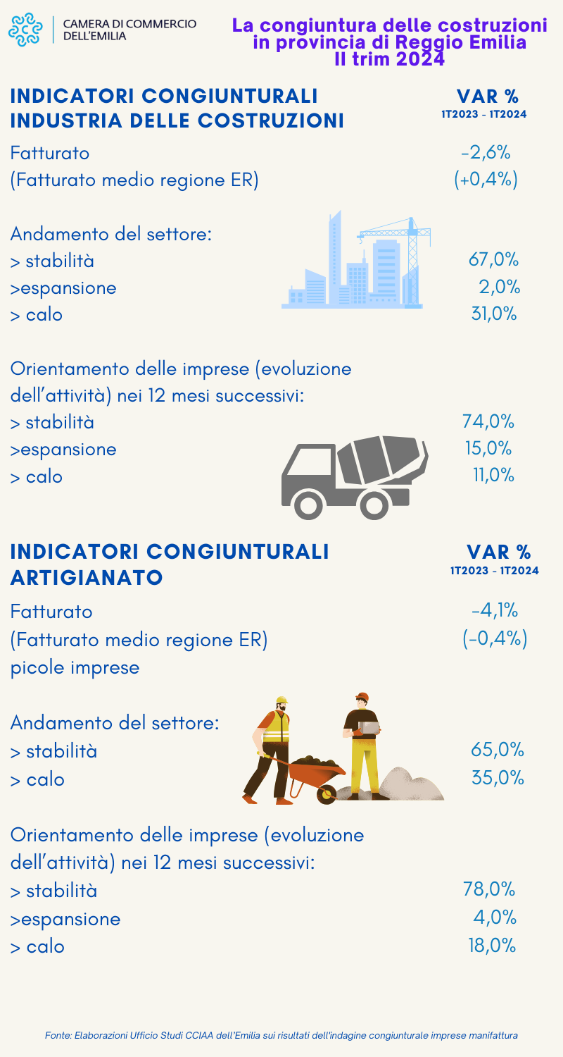 Nel secondo trimestre 2024 il fatturato del settore delle costruzioni evidenzia a Reggio Emilia un calo del 2,6% rispetto allo stesso periodo del 2023. La flessione, che emerge dalle analisi dell’ufficio Studi della Camera di commercio dell’Emilia sulle piccole e medie imprese, si contrappone alla lieve crescita regionale (+0,4%), e il calo è più rilevante nell’artigianato (-4,1%), rispetto alla flessione regionale dello 0,4%.