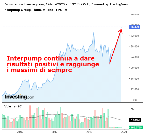 Nella crisi generale ci piace evidenziare un’azienda reggiana che continua a dare risultati importanti e grandi soddisfazioni agli investitori. Interpump ha sovraperformato il mercato e dai minimi di marzo ora ha raggiunto i 35 euro collocandosi ai massimi della sua storia dal momento della quotazione.