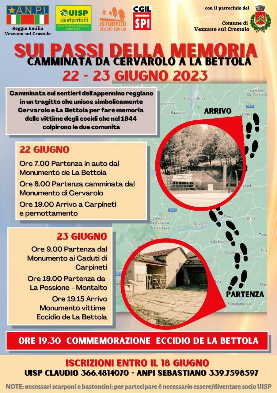 “Sui passi della memoria da Cervarolo a La Bettola” è il titolo delle due giornate di cammino organizzate in occasione del 79° Anniversario dell’eccidio avvenuto nella notte di San Giovanni del 1944 nella frazione vezzanese: un percorso che unisce fisicamente, ed in questo caso anche simbolicamente, Cervarolo e La Bettola per fare memoria degli eccidi che nello stesso anno colpirono le due comunità, attraversando anche altri luoghi di memoria.