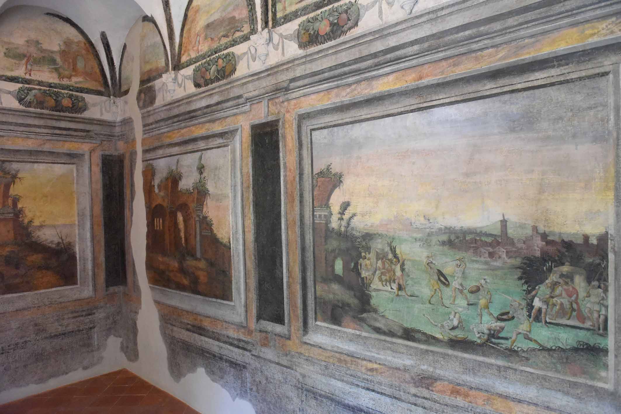 Il secondo ambiente, detto Camerino dell’Ariosto, identificato dalla storia come lo studiolo del poeta, reca alle pareti una serie di riquadri raffiguranti vedute paesaggistiche che rimandano al Parco antistante la Villa e adiacenze che costituivano le possessioni dei Malaguzzi. Nelle lunette è illustrata la novella di Giletta di Narbona e Beltramo di Rossiglione, novella dedicata ancora una volta all’amore muliebre e all’importanza della prole, che purtroppo Orazio Malaguzzi non avrà mai.