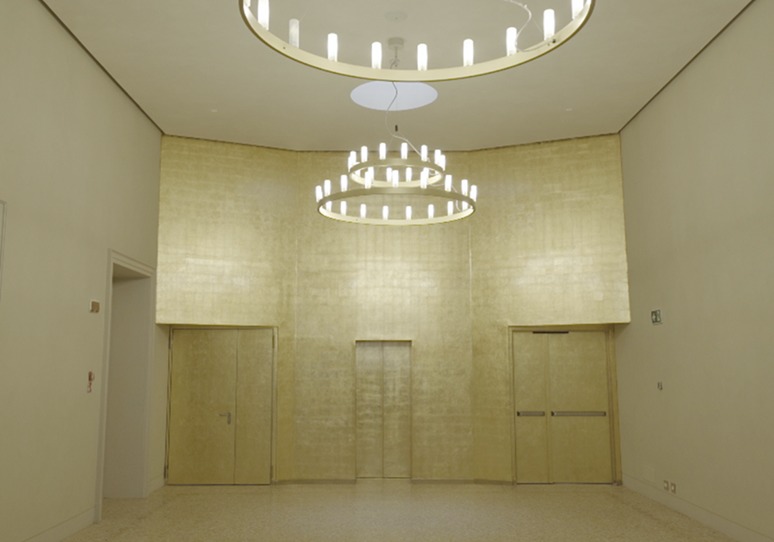 I lavori si sono concentrati soprattutto nel rendere la Sala conforme ai criteri di sicurezza e di accessibilità, rifatti gli impianti e riqualificata l’acustica, grazie ad un pavimento in legno e a una controsoffittatura, costituita da un sistema di pannelli appesi, posti a bandiera, intercalati dall’illuminazione realizzata con spot a led. Rifatti completamente i camerini a sud della Sala e i servizi igienici del pubblico sul lato nord. L’atrio di ingresso si basa su elementi contemporanei, soprattutto luce e materiali pregiati: il luogo è caratterizzato da un pavimento in seminato alla veneziana chiaro, una parete di fondo che racchiude l’uscita dell’ascensore e le porte laterali color oro, una controsoffittatura orizzontale staccata dai muri, da cui scenda una lama di luce, due grandi lampadari che interpretano in chiave moderna gli antichi candelieri.