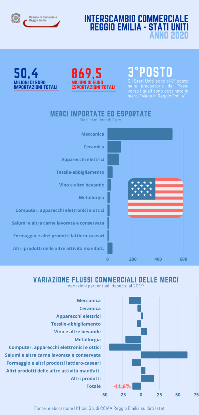 Nel 2021 la Camera di commercio di Reggio punta a un rapido recupero e a una nuova crescita del valore dell’export emiliano verso gli Stati Uniti, che lo scorso anno ha accusato una flessione dell’11,6% a causa della pandemia di nuovo coronavirus.