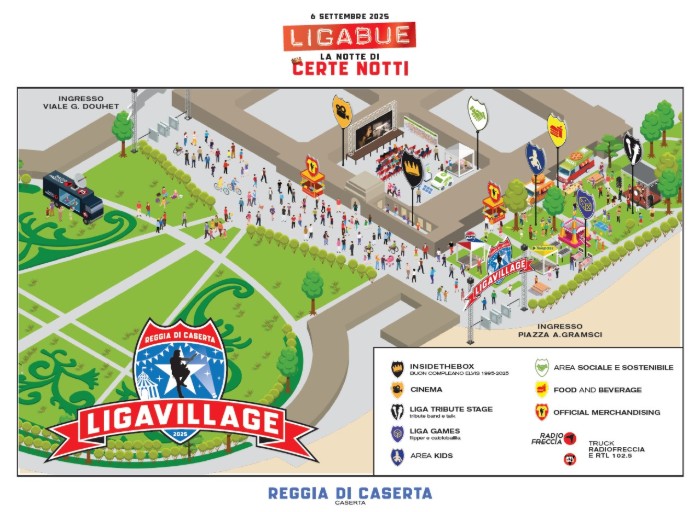 Sull’esempio dell’Iren Green Park di Reggio, anche a Caserta è presente il Ligavillage, allestito tra i cortili e i giardini della Reggia, per far vivere a tutti un’esperienza immersiva nel mondo del Liga con varie attività: lo spazio Liga Games (tra flipper e calcio balilla), il corner InsideTheBox – Buon Compleanno Elvis 1995-2025 (con mostra fotografica e memorabilia), l’area merchandising, i punti ristorazione, l’area cinema, il Tribute Stage (a disposizione per momenti di musica live e tribute band), i talk del BarMario, l’area Kids.