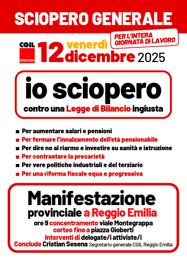 Lo sciopero interessa tutti i settori, pubblici e privati, per l’intera giornata. Sono previste manifestazioni in tutte le principali città italiane: a Reggio il corteo partirà dalla via Emilia, all’angolo con viale Montegrappa, e terminerà in piazza Gioberti, dove è previsto il comizio finale con gli interventi di delegate e delegati e le conclusioni del segretario provinciale della Cgil Cristian Sesena.