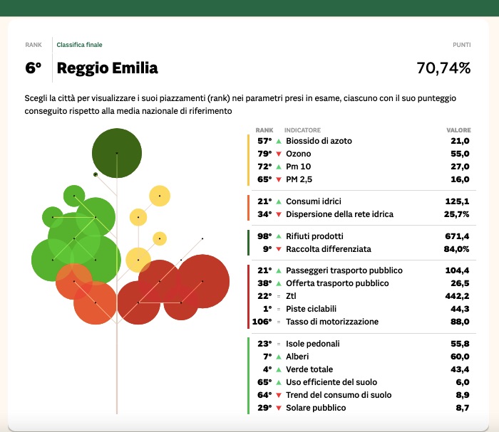 Reggio, pur avendo perso qualche gradino in classifica generale, mantiene comunque alcune posizioni di rilievo a livello nazionale: è prima in Italia per piste ciclabili, quarta per verde totale, settima per numero di alberi, nona per quanto riguarda la raccolta differenziata; ma è ultima in classifica, invece, per il tasso di motorizzazione.