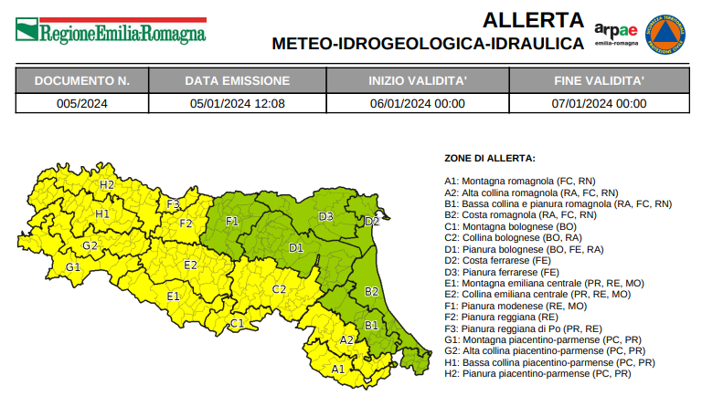 Spiega il bollettino: “Nella giornata di sabato 6 gennaio sono previste piogge diffuse con accumuli localmente elevati sulle aree appenniniche, che potranno generare localizzati fenomeni franosi, ruscellamenti e innalzamenti dei livelli idrometrici dei corsi d’acqua. Nei tratti vallivi dei bacini del settore occidentale si prevede la propagazione delle piene con livelli idrometrici attorno alla soglia 1.