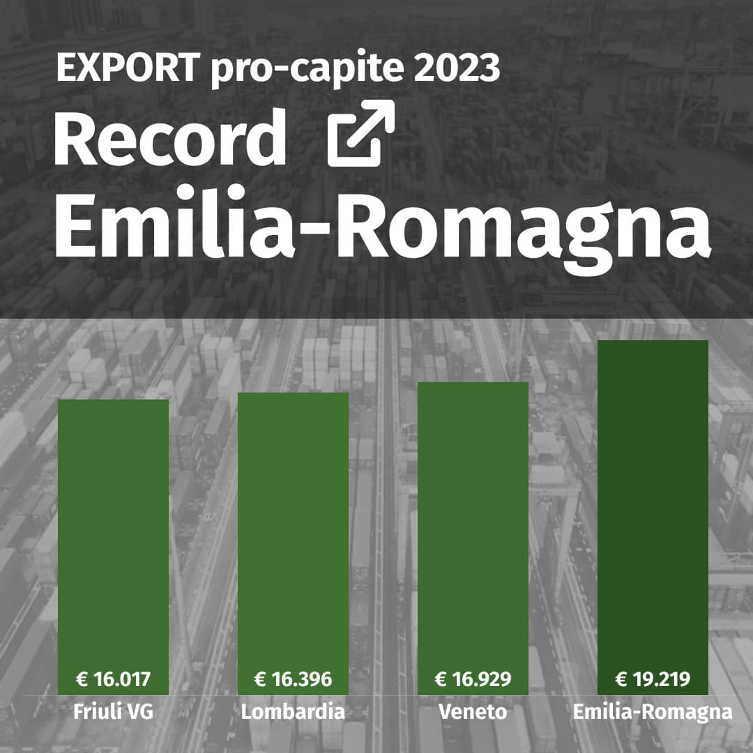 Il presidente della Regione Stefano Bonaccini a commentato così i numeri dell’Istat: “Nonostante la drammatica alluvione, l’Emilia-Romagna conferma il netto primato nazionale per export pro-capite. Nel 2023, si sono registrati 19.219 euro di esportazioni per residente, quasi il 181% del valore medio nazionale (10.641 euro per abitante). Seguono Veneto (16.929 euro), Lombardia (16.396 euro) e Friuli-Venezia Giulia (16.017 euro).
