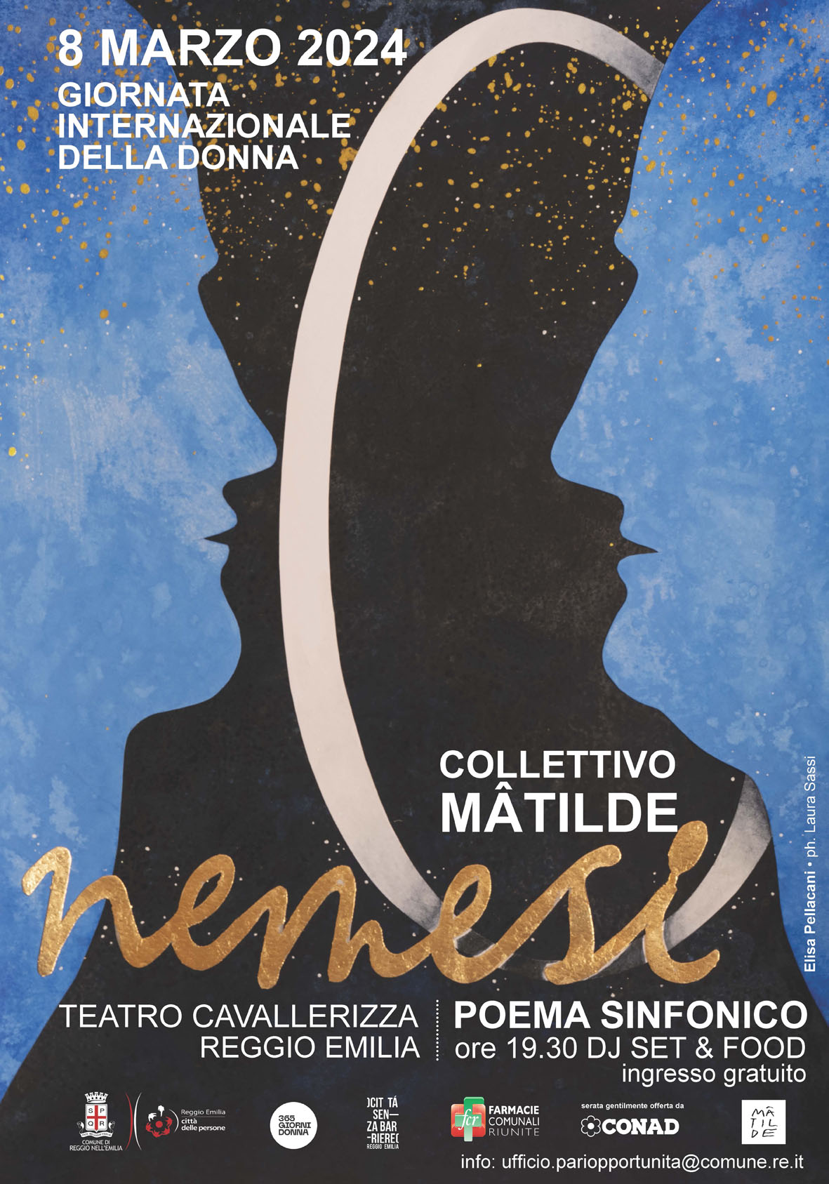 Alla sera, le celebrazioni si spostano al Teatro Cavallerizza dove – dopo un aperitivo con dj set e musica offerto a tutte le donne della città a partire dalle 19.30 – è in programma, alle 20.30 a ingresso libero, la performance musicale “Nemesi” a cura del Collettivo Mâtilde. Nemesi è un poema sinfonico in cinque atti della durata di circa un’ora, ideato e realizzato dallo stesso collettivo. Il progetto nasce nel 2020 da un’esperienza del collettivo “La voce del lago” di cui si troverà un estratto nello spettacolo: una performance in cui le musiciste improvvisano con i suoni della natura (l’acqua e il ghiaccio, l’erba, i rami…) mescolandosi alla voce antica del lago.